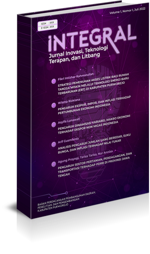 Vol 1 No 1 (2022)Edisi pertama ini menampilkan 5 (lima) artikel bersumber dari berbagai kegiatan yang dilakukan oleh masyarakat daerah berbagai daerah/ instansi dan berbagai bidang ilmu dengan judul sebagai berikut: 1) Strategi Pemenuhan Akses Listrik bagi Rumah Tangga Miskin melalui Teknologi Energi Baru Terbarukan (EBT) di Kabupaten Purworejo; 2) Pengaruh Ekspor, Impor, dan Inflasi Terhadap Pertumbuhan Ekonomi Indonesia; 3) Pengaruh Dinamisasi Variabel Makro Ekonomi Terhadap Ekspor Non Migas Indonesia; 4) Analisis Pengaruh Jumlah Uang Beredar, Suku Bunga, dan Inflasi terhadap Nilai Tukar; serta 5) Pengaruh Sektor Pertanian, Perdagangan, dan Transportasi Terhadap PDRB di Provinsi Jawa Tengah. Penulis berasal dari dua institusi yaitu Bappedalitbang Kabupaten Purworejo dan Universitas Tidar Magelang.