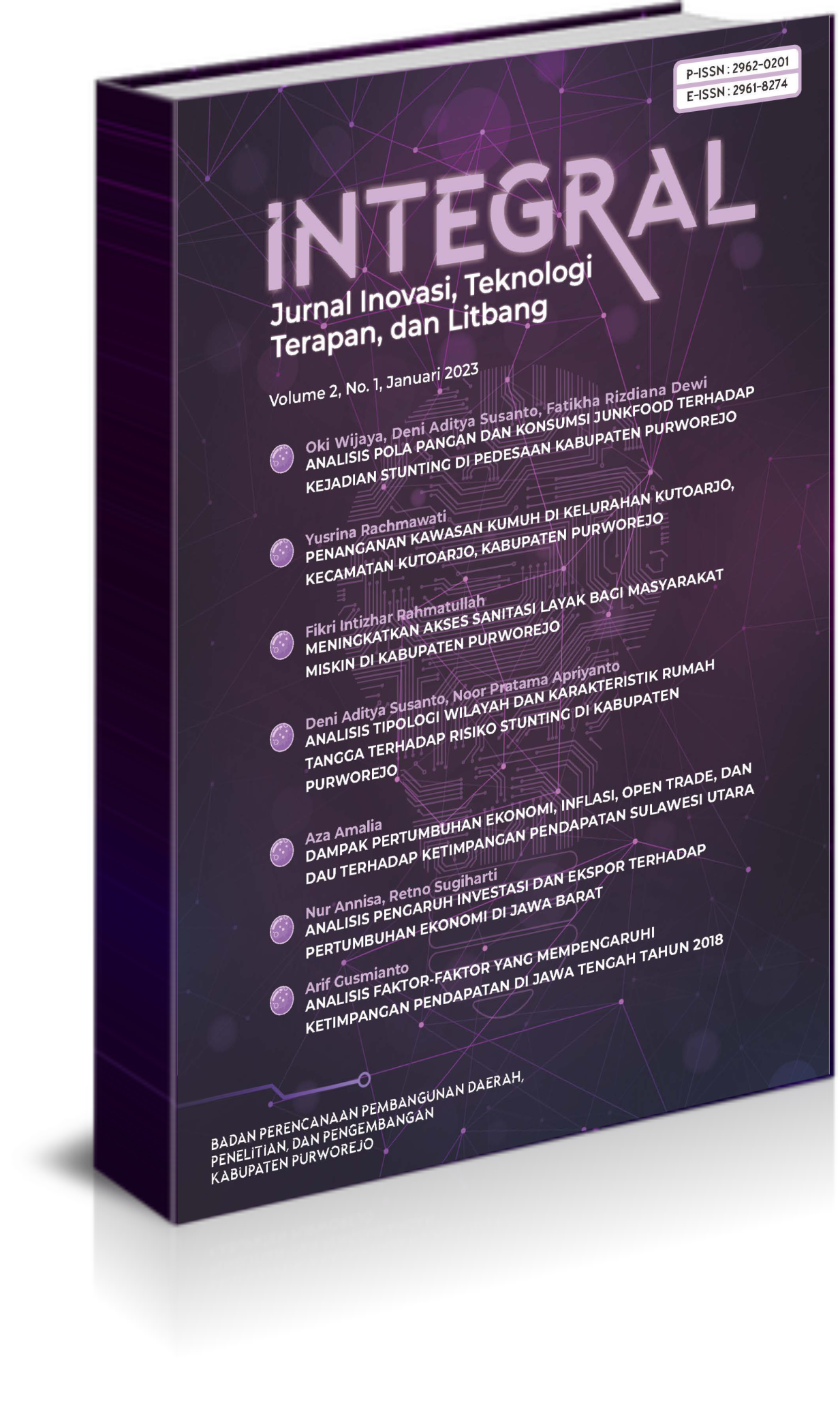 Vol 2 No 1 (2023)Edisi kedua ini menampilkan 7 (tujuh) artikel bersumber dari berbagai kegiatan yang dilakukan oleh masyarakat daerah berbagai daerah/ instansi dan berbagai bidang ilmu dengan judul sebagai berikut: 1) Analisis Pola Pangan dan Konsumsi Junkfood Terhadap Kejadian Stunting di Pedesaan Kabupaten Purworejo; 2) Penanganan Kawasan Kumuh Di Kelurahan Kutoarjo, Kecamatan Kutoarjo, Kabupaten Purworejo; 3) Meningkatkan Akses Sanitasi Layak bagi Masyarakat Miskin di Kabupaten Purworejo; 4) Analisis Tipologi Wilayah dan Karakteristik Rumah Tangga Terhadap Risiko Stunting di Kabupaten Purworejo; 5) Dampak Pertumbuhan Ekonomi, Inflasi, Open Trade , dan DAU Terhadap Ketimpangan Pendapatan Sulawesi Utara; 6) Analisis Pengaruh Investasi dan Ekspor Terhadap Pertumbuhan Ekonomi di Jawa Barat, dan 7) Analisis Faktor-Faktor yang Mempengaruhi Ketimpangan Pendapatan di Jawa Tengah tahun 2018. Penulis berasal dari beberapa institusi yaitu Bappedalitbang Kabupaten Purworejo, Universitas Tidar Magelang, dan Creavill Yogyakarta.