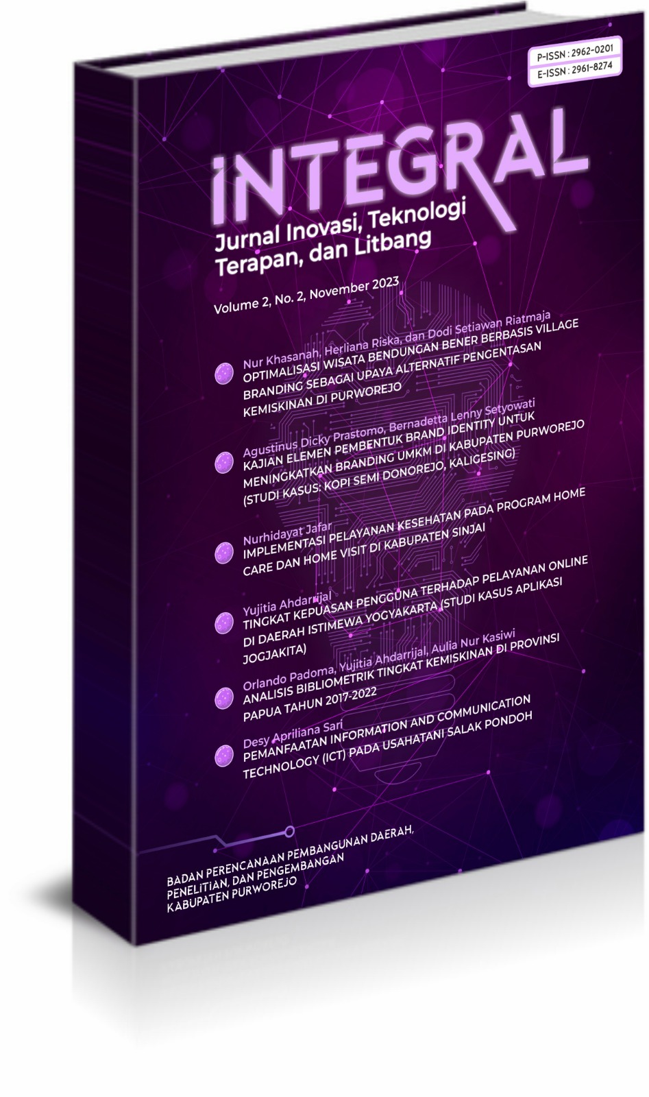 Vol 2 No 2 (2023)Edisi kali ini menampilkan 6 (artikel) artikel bersumber dari berbagai kegiatan yang dilakukan oleh masyarakat daerah berbagai daerah/instansi dan berbagai bidang ilmu dengan judul sebagai berikut: 1) Optimalisasi Wisata Bendungan Bener Berbasis Village Branding Sebagai Upaya Alternatif Pengentasan Kemiskinan di Purworejo; 2) Kajian Elemen Pembentuk Brand Identity untuk Meningkatkan Branding UMKM di Kabupaten Purworejo (Studi Kasus: Kopi Semi Donorejo, Kaligesing); 3) Implementasi Pelayanan Kesehatan Pada Program Home Care Dan Home Visit Di Kabupaten Sinjai; 4) Tingkat Kepuasan Pengguna terhadap Pelayanan Online di Daerah Istimewa Yogyakarta (Studi Kasus Aplikasi Jogjakita); 5) Analisis Bibliometrik Tingkat Kemiskinan di Provinsi Papua Tahun 2017-2022; 6) Pemanfaatan Information and Communication Technology (ICT) pada Usahatani Salak Pondoh.